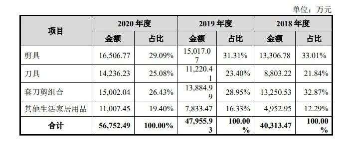 从财报中的营业收入构成情况来看,2018年至2020年,张小泉剪具的收入分别为1.33亿元、1.50亿元、1.65亿元,整体营收增长,但剪具对公司总营收的贡献分别为33.01%、31.31%、29.09%,呈下降态势。也就是说让张小泉成名的剪具业务正在被边缘化。