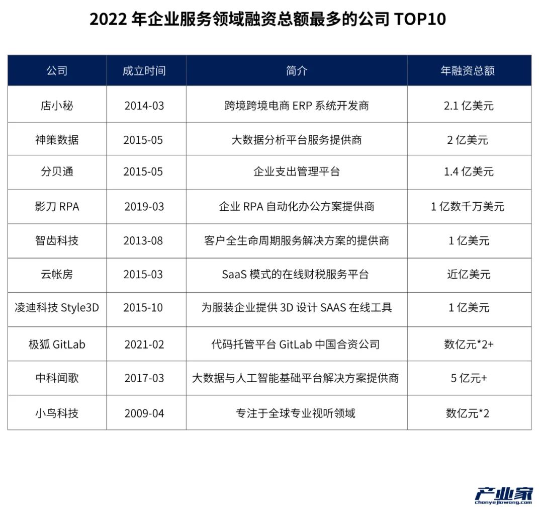 根据IT桔子2022年企业服务领域融资总额最多公司来看,致力于跨境电商 ERP 系统开发商店小秘、大数据分析平台服务提供商神策数据、企业支出管理平台分贝通 、企业 RPA 自动化办公方案提供商影刀 RPA 、客户全生命周期服务解决方案的提供商智齿科技成为过去一年融资总额TOP5。