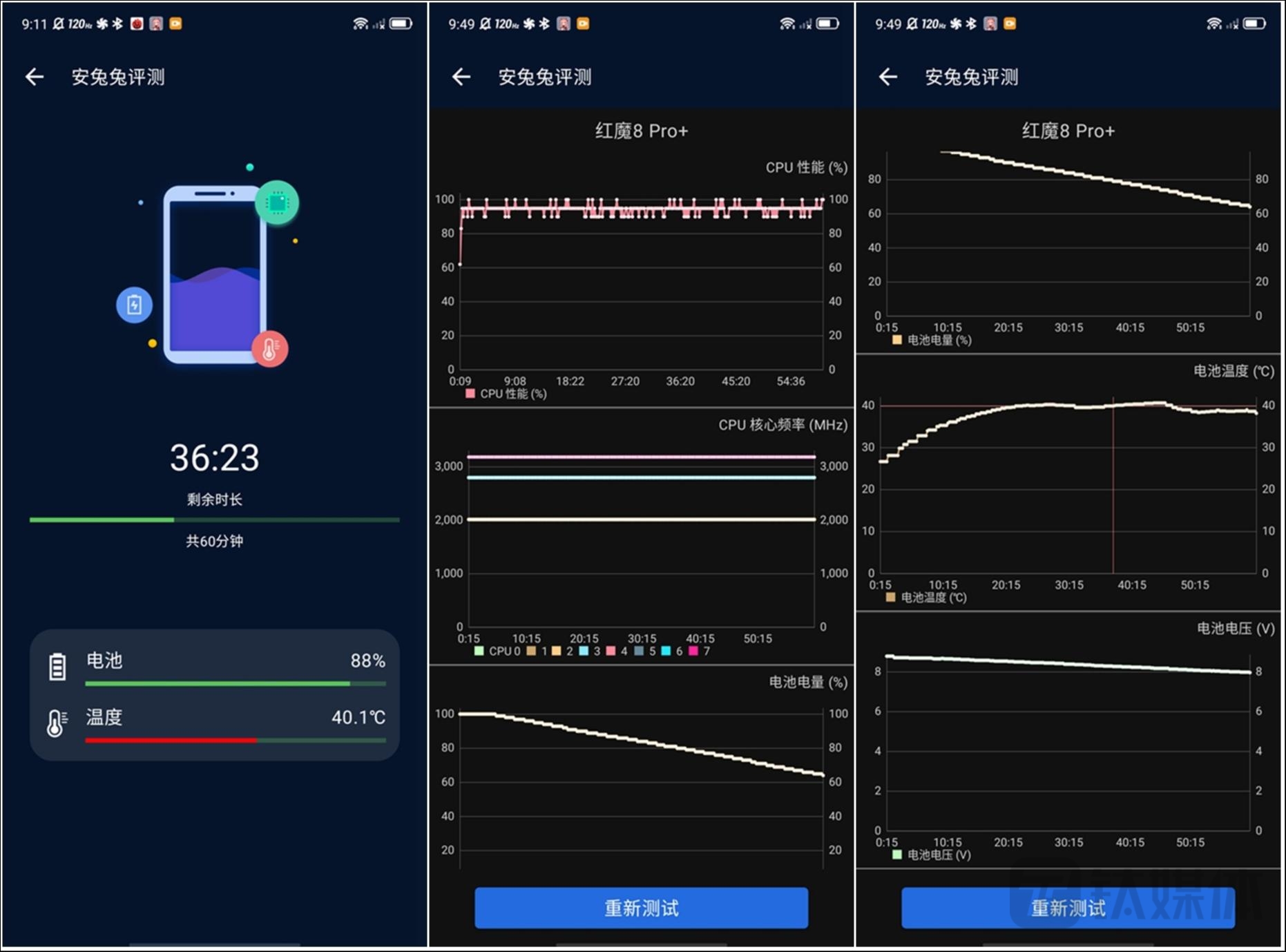 除了持续的游戏测试以外,钛媒体App还用烤机软件进行了较为极限环境的压力测试,首先是安兔兔60分钟压力测试,要知道之前很多产品在30~45分钟的测试中都能达到45乃至50℃以上的温度,而且在达到高温后,SoC也会有非常明显的降频问题。而红魔8 Pro+在风扇的呼啸下,依然能够压制住“燥热”,最高温度可以控制在41℃。