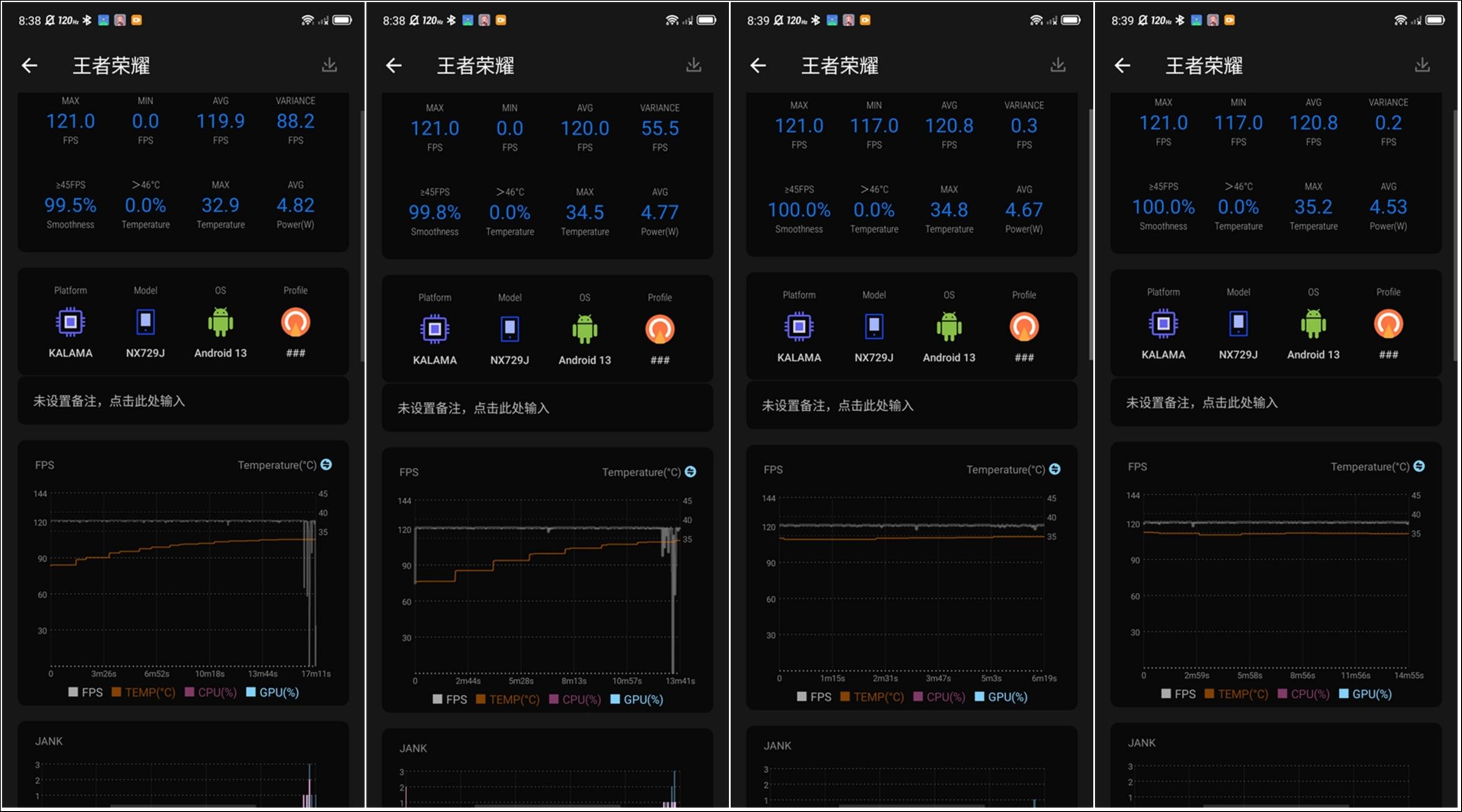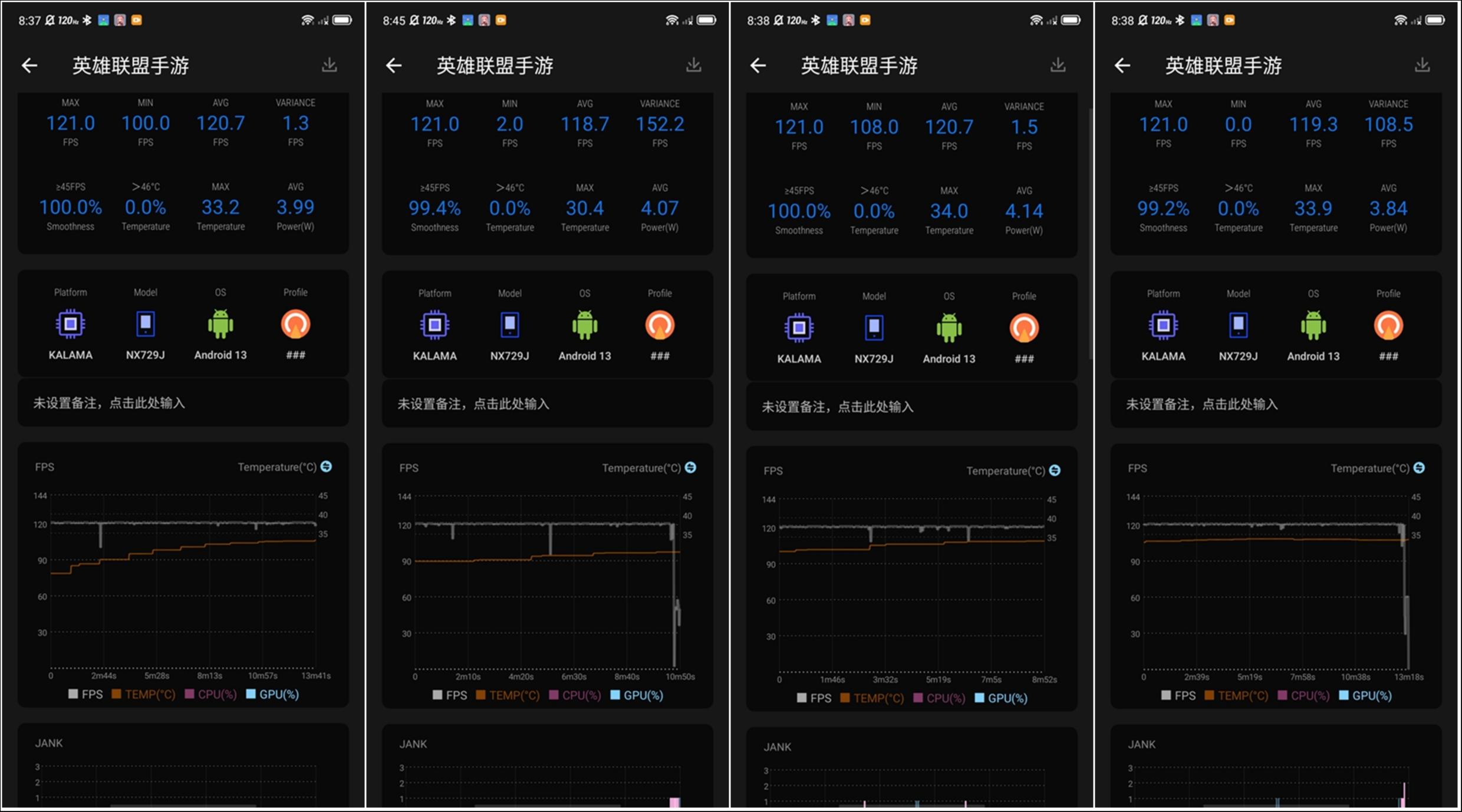 另一款游戏《英雄联盟手游》也有着类似的表现,画面同样是120Hz最高帧率+最高画质,在能够持续稳定输出120FPS画面的同时,红魔8 Pro+最后的温度也稳定在35℃左右。当前SoC性能以及厂商机体的散热能力,对于短时间的游戏而言,基本都没什么压力,但如果你想周末冲一波段位或者跟朋友持续开黑,那么像游戏手机所提供的稳定帧率就变得更加重要,自己不烫手的同时,也不会因为画面的突然卡顿成为团队的“被突破口”。