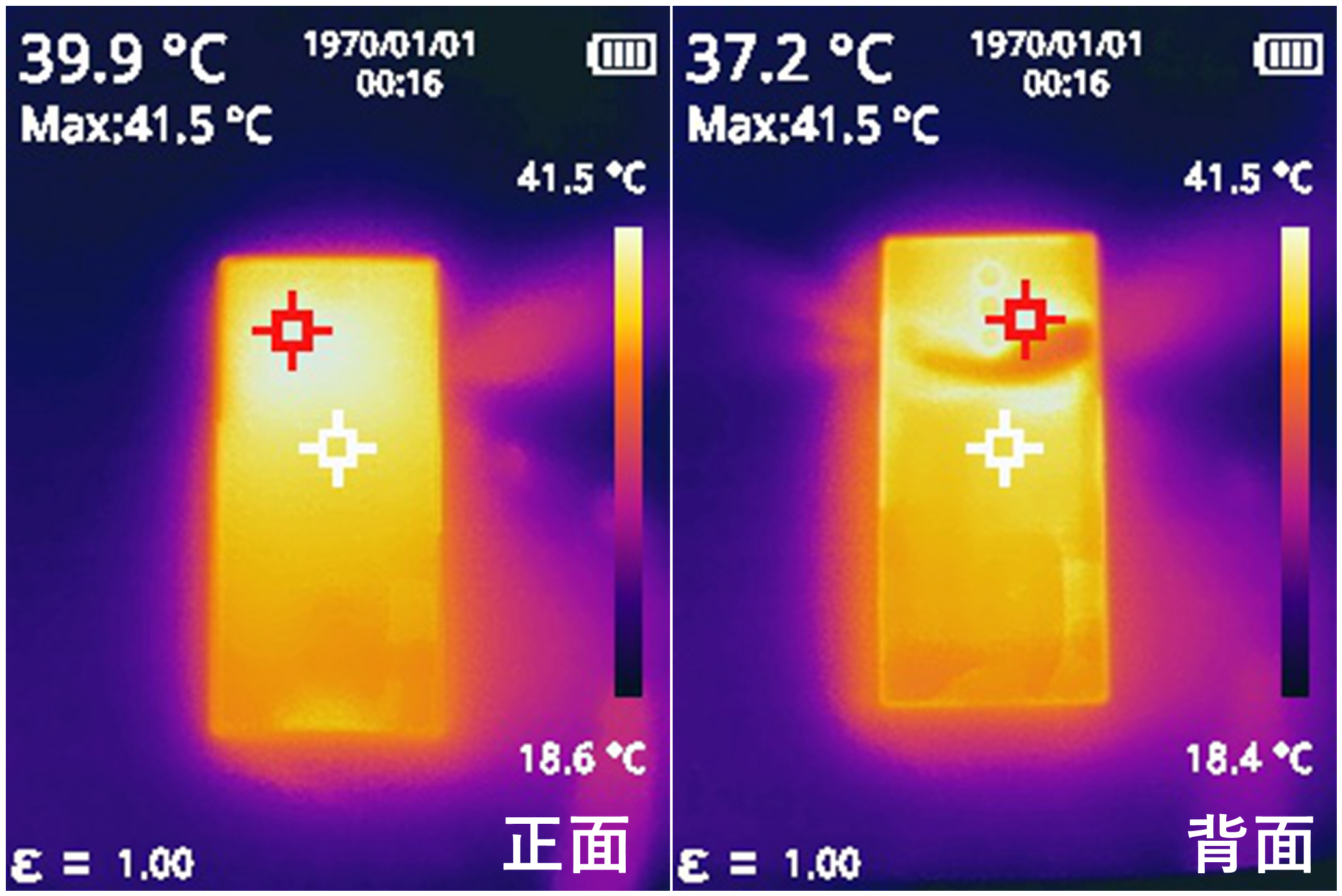 烤机测试中,钛媒体App还在机器处于烤机的阶段用热成像仪对产品正面、背面进行了测温,这也能直观反应出红魔8 Pro+极限场景的温度表现,最终正面最高温度出现在上侧达到了41.5℃,整体在40℃左右,背面则不出意外的在中间,同样也是41.5℃,可以说对于这款产品而言,无论是各种大作还是持续游玩,都不用担心会出现“烫手”的情况。