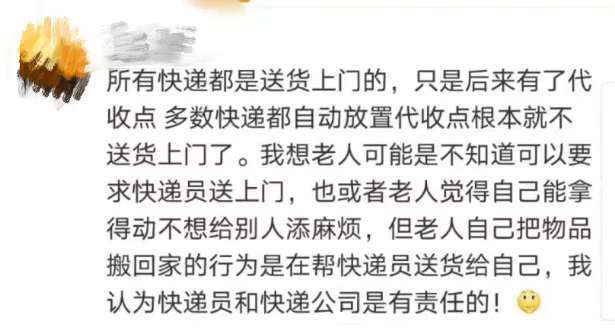 更让人难以接受的是,一些上了年纪的老人也经常走很长的路去取一件或许很重的快递,比如一袋子猫砂,几十斤重,如果楼层又比较高,老人是搬不上去的。