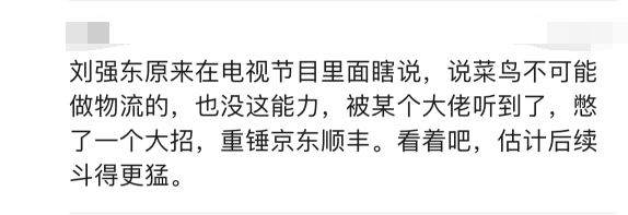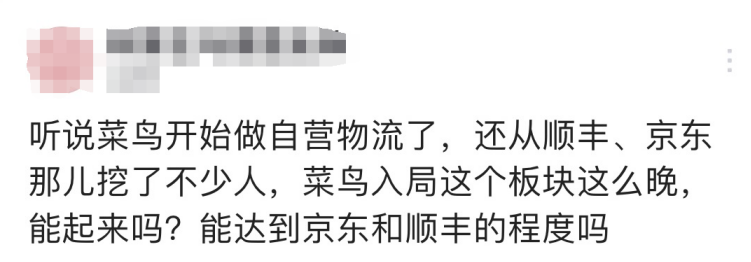 有人发出质疑菜鸟入局这个板块这么晚,能达到京东、顺丰的程度吗?
