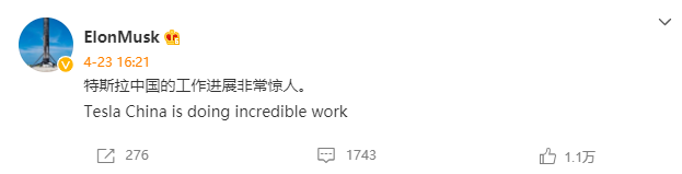 4月23日,马斯克在微博发文称特斯拉中国的工作进展非常惊人。据此前报道,4月19日,关闭了近3周的特斯拉上海临港超级工厂迎来复工,8000名员工一早就到岗,当天也实现近600辆整车下线。