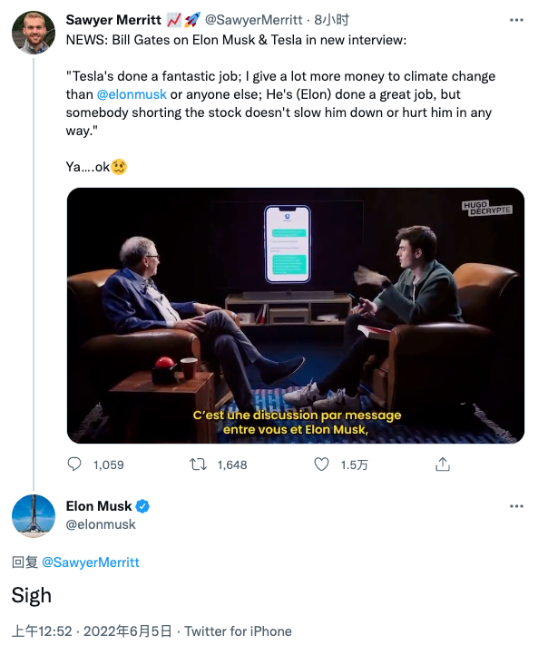 先是前任世界首富比尔·盖茨回应做空特斯拉一事,并表示做空股票的人没有以任何方式拖累他或伤害他。这引来马斯克的一声叹息。