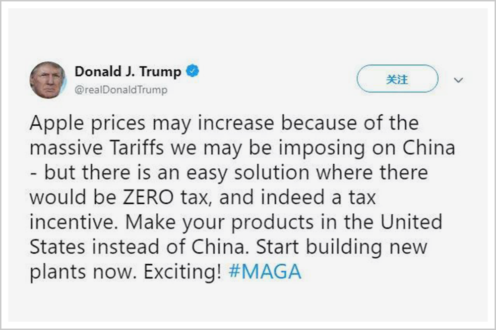 特朗普多次在推特发文,点名威胁苹果、福特、通用等公司,要它们在美国本土建厂,否则就要征收一次性进口边境税。