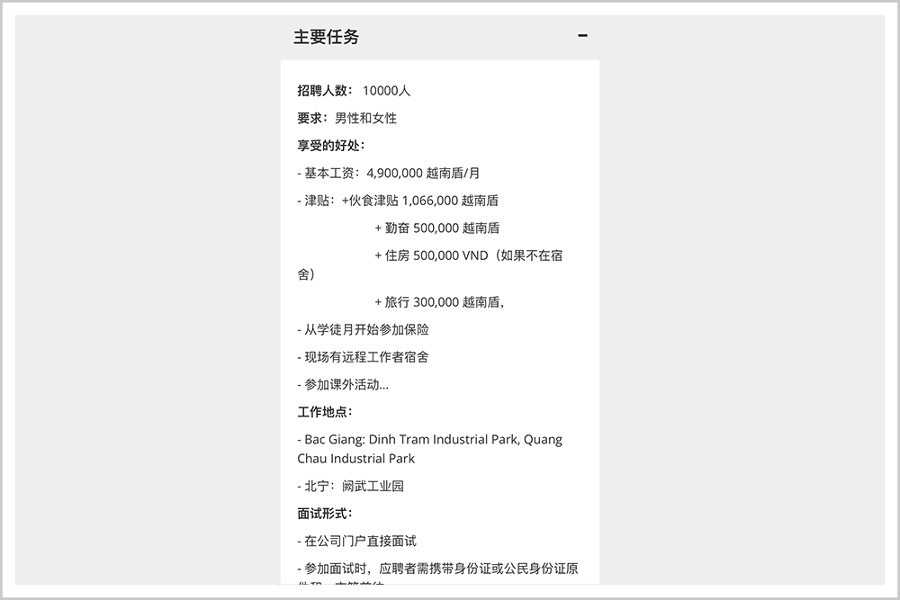 从越南富士康官网的招聘信息来看,其底薪是490万越南盾,折合人民币为1427.51元,即便加上106.6万越南盾的伙食津贴、30万越南盾旅行津贴、以及累计100万越南盾的勤奋津贴和住房津贴,一个越南工人在不加班的情况下,薪资兑换成人民币为2116.8元。