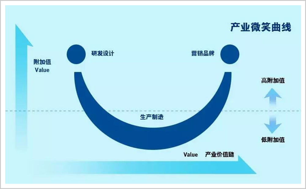 产业经济学有一个著名的理论:微笑曲线。处于曲线两端的是研发和品牌营销环节,属于高利润,曲线中间的便是富士康所在的制造环节,利润最低,劳动密集。