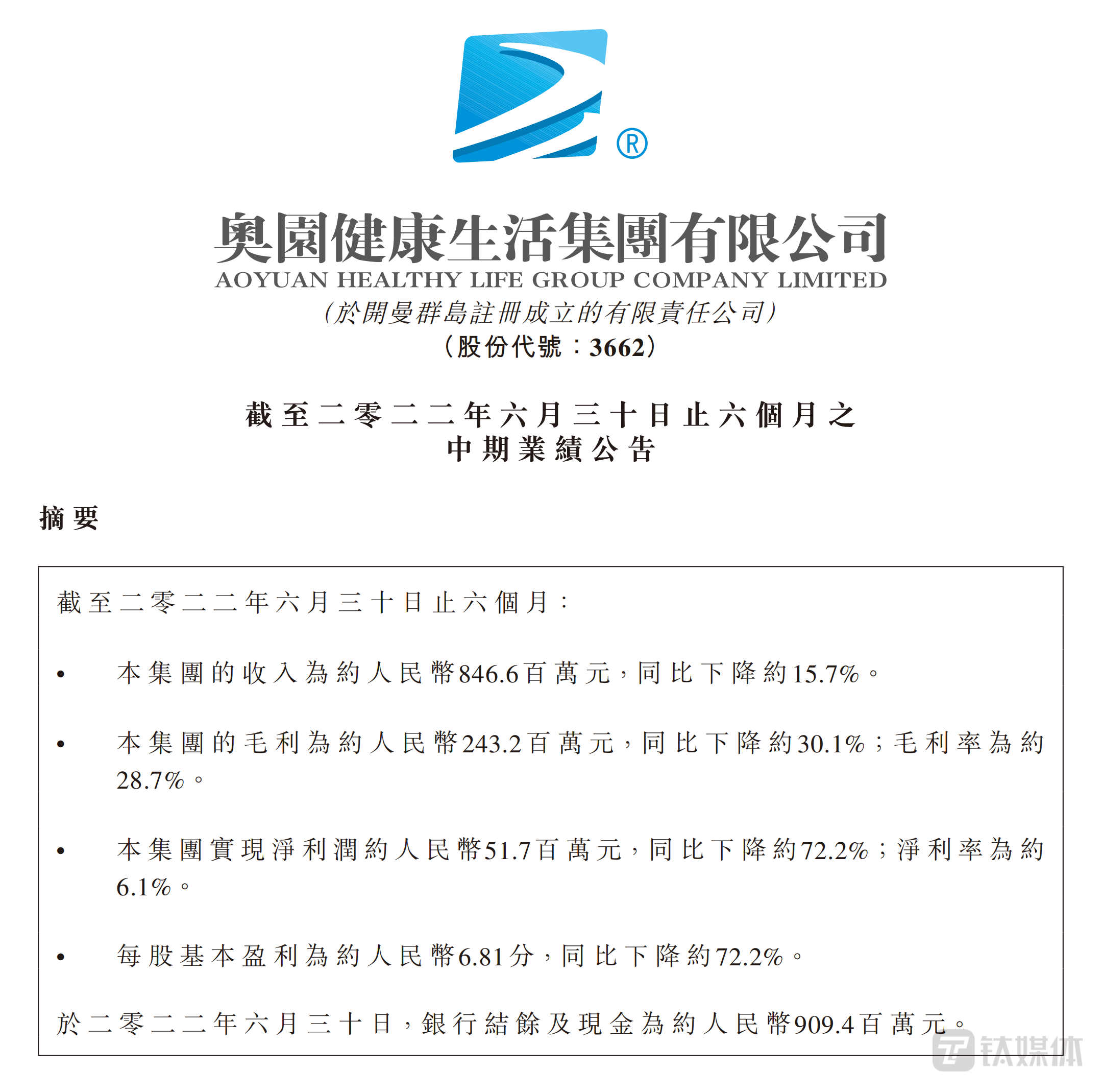 再来看2022年中期业绩,据财报显示,2022年上半年,奥园健康收入约8.466亿元,同比下降15.7%;毛利约2.432亿元,同比下降30.1%;毛利率为28.7%;净利润约5170万元,同比下降72.2%;净利率为6.1%。