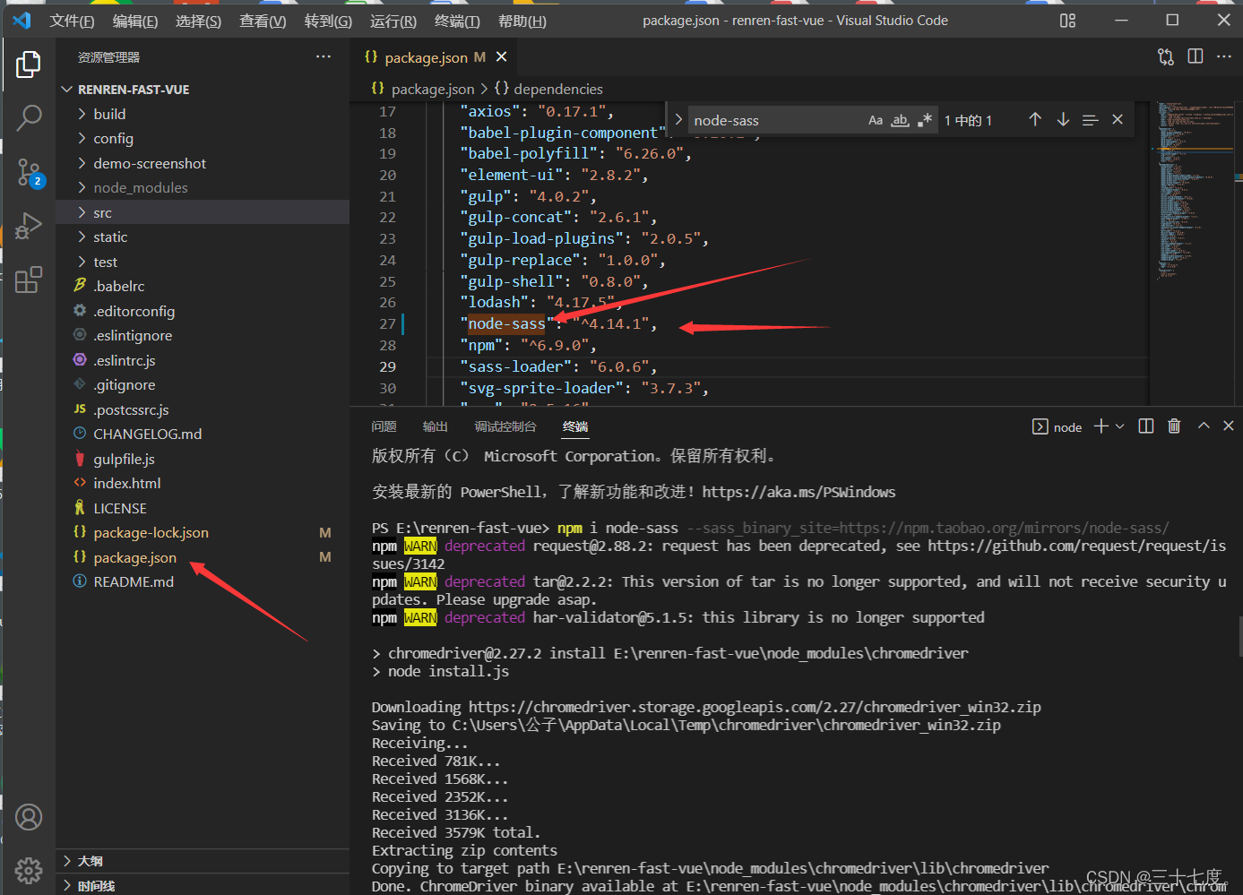 1、首先把项目文件夹下的package.json里面的node-sass4.9.0改成4.9.2(不改可能也没关系,不过我改了,防止踩坑)
