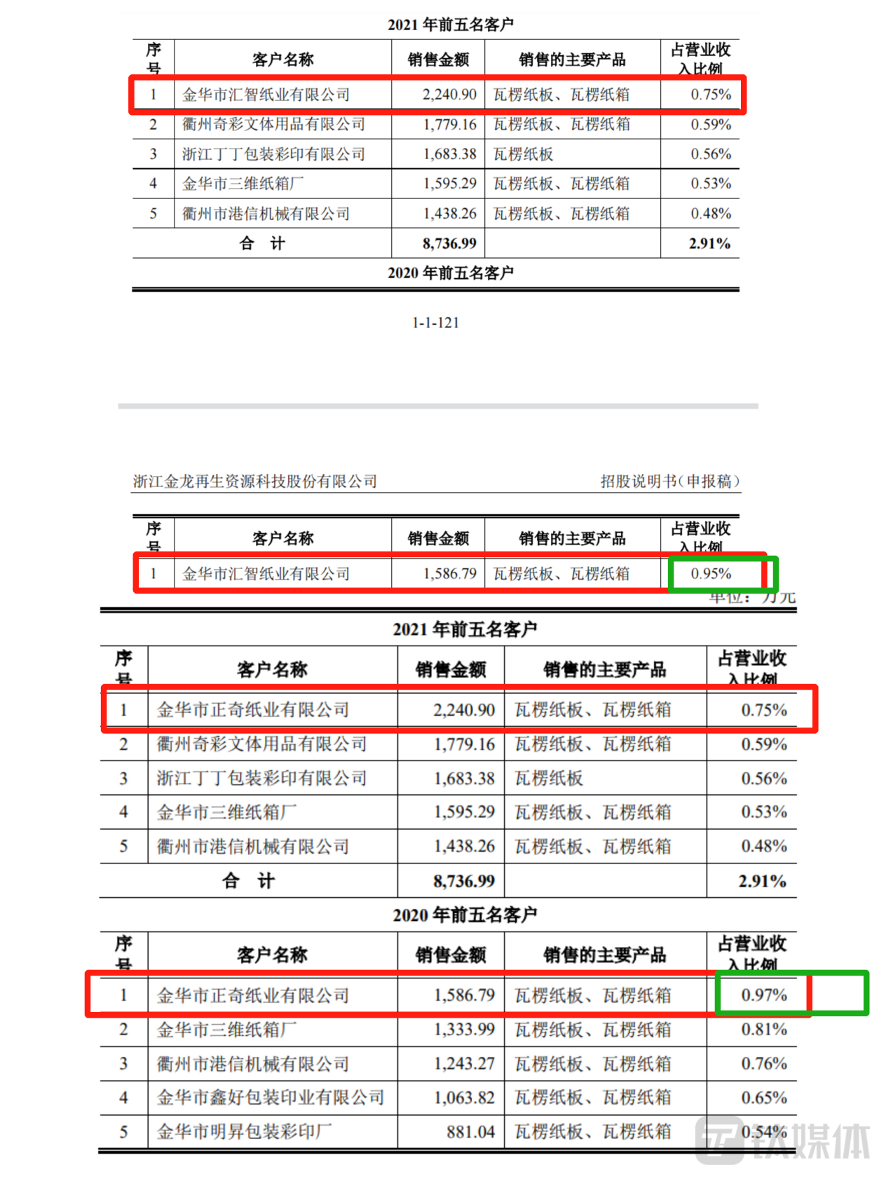 其三,金华市汇智纸业有限公司(以下简称“汇智纸业”)未成立就与金龙股份合作在先。纸制品业务前五大客户中,汇智纸业于2020年、2021年及2022年上半年对金龙股份产生的销售分别为1586.79万元、2240.9万元、1199.91万元,占总营收的比重分别为0.95%、0.75%、0.86%。企查查数据显示,汇智纸业成立于2021年11月23日。可令人疑惑的是,金龙股份在2020年就已经与其进行贸易往来。
