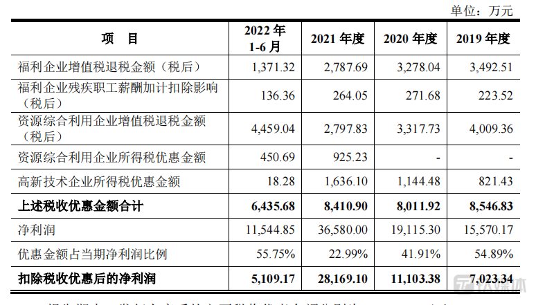 值得注意的是,金龙股份录得的净利润并非全部来源于经营收入,有相当一部分来自于税收优惠。金龙股份享受的税收优惠政策主要包括高新技术企业税收优惠、福利企业税收优惠、资源综合利用税收优惠等。2019年至2021年及2022年上半年(以下简称“报告期内”),金龙股份所得税收优惠金额合计分别为8546.83万元、8011.92万元、8410.9万元、6435.68万元,占当期净利润比例分别为54.89%、41.91%、22.99%、55.75%。也就是说,扣除税收优惠后金龙股份所得净利润为7023.34万元、11103.38万元、28169.1万元、5109.17万元。