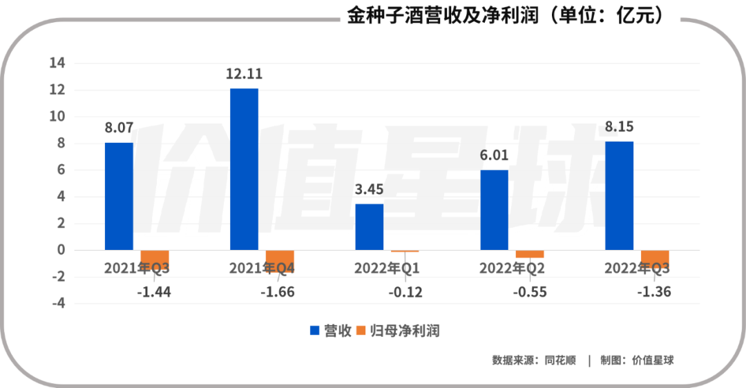 从财报来看金种子酒的表现也不理想,2022年第三季度,金种子酒的销售费用同比涨了9.46%,但是大量的销售投入并没有转化为利润,当季净利润只有-1.36亿,亏损幅度扩大了147%。