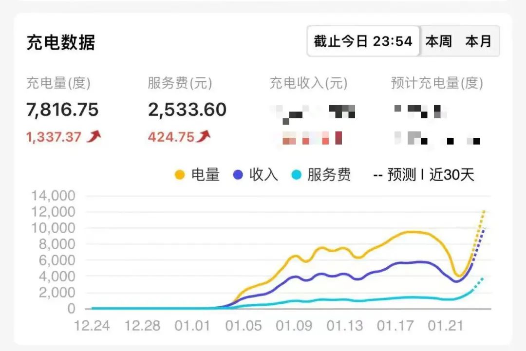 林重点的茂名充电站是2023年1月3日上线,1月5日正式营业,仅用了4天,单枪日充电就达到了200度;1月18日前后达到300度;而1月23日,茂名充电站的服务费收入就达到了2533.60元。按照合作建站协议,林重点可以拿到65%,即1646.84元。“每天除了电损,就是场租了,其它的支出可以忽略不计。”