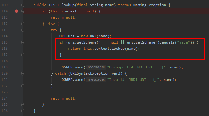 2、JndiManager中的lookup功能仅支持java协议,因此即使存在通过MDC进行JNDI注入攻击的漏洞,那攻击者也无法利用诸如rmi、ldap等协议进行攻击了。