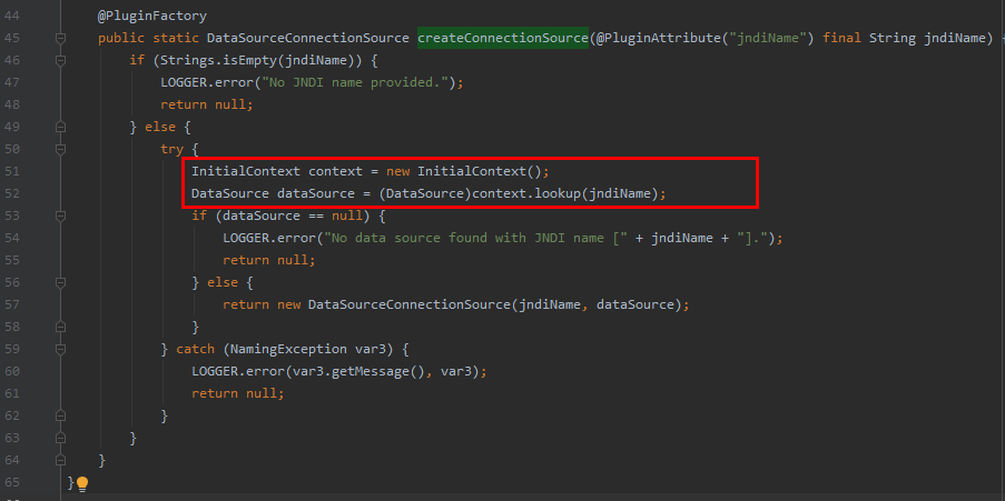 这时大家可能会有疑问,就是从2.16开始,其实已经默认禁用了JNDI功能,但是为什么在默认情况下,上述的JNDI注入还可以攻击成功呢?追到lookup执行处就一目了然了,代码位于org.apache.logging.log4j.core.appender.db.jdbc.DataSourceConnectionSource#createConnectionSource处,可以看到这里是直接new了一个InitialContext对象执行的lookup,并没有通过JndiManager去执行lookup功能,而在2.16添加的enableJndi属性仅仅对受JndiManager管理的资源有用。因此这里的lookup并不受enableJndi属性的管理,因此可在默认情况下进行JNDI注入攻击: