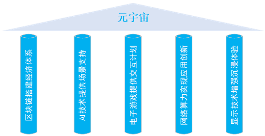 区块链搭建经济体系、AI技术提供场景支撑、电子游戏提供交互机会、网络算力实现应用创新、显示技术增强沉浸体验,通过五大技术体系的深度融合构成元宇宙的5大支柱。
