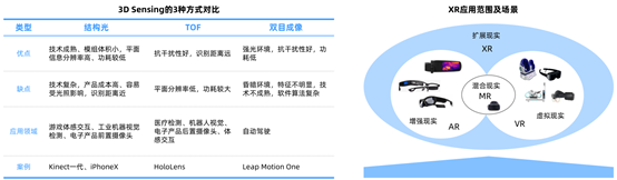 3D Sensing(3D传感)是XR功能的技术核心。市场主流的硬件产品都需要搭载3D Sensing,3D Sensing是由多个摄像头加深度传感器组成的,在色彩、分辨率、观测距离、抗干扰及夜视等方面优于2D摄像头,还可实时采集物体三维位置及尺寸信息。目前市场上有3种主流方案,按成熟度从高到低依次为:结构光、飞行时间(TOF)和双目成像。结构光是通过激光的折射及算法计算出物体的位置和深度信息,进而复原整个三维空间。TOF是一种光雷达系统,可从发射极向对象发射光脉冲,接收器则可通过计算光脉冲从发射器到对象、再返回到接收器的运行时间来确定被测量对象的距离。双目成像是使用两个或两个以上的摄像头同时采集图像,通过比对这些不同摄像头在同一时刻获得的图像差别,使用算法来计算深度信息。