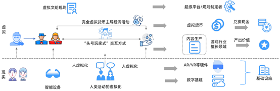 虚拟世界的基础运行,处于元宇宙原始阶段的最初形态。首先要对参与者、对人类行为活动、经济等生活所需要素禀赋进行网络虚拟化,为虚拟世界的建设打造基础设施与规则,想要虚拟世界线完整运行,不可或缺的要素有真实玩家、人物虚拟角色、数字基建负责虚拟世界存在、交互平台、主导经济物(虚拟货币)、和内容生产,除此之外,对于虚拟世界的虚拟文明规定,还需要有超级平台或规则制定者存在管理虚拟世界秩序。