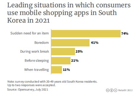 根据国际货币基金组织的报告,2021年,74%的韩国消费者使用移动App网购是因为「突然急需某件物品」,这个比例超过了41%的人「闲逛」网购人群,也高于25%的「工作间隙休息刷刷手机」的网购群体。