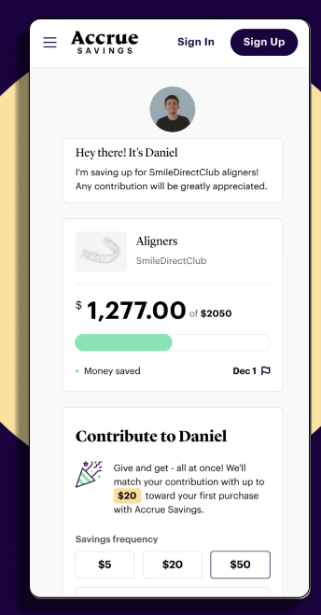 Accrue还让用户可以向亲朋好友“讨钱”,支援存钱计划,平台有时还会匹配亲朋好友的捐赠数额,用户若改变主意可随时撤回已经积累的储蓄,但Accrue给予的返现优惠可仍旧保留。