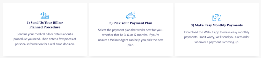 Walnut希望可以帮用户们提供一个可负担的解决方案,用户只需提交医疗账单,Walnut就会自动拆分成3、6或12个月还款方案,不收取额外费用或利息,还包含了心理咨询等普通医保不包的领域。