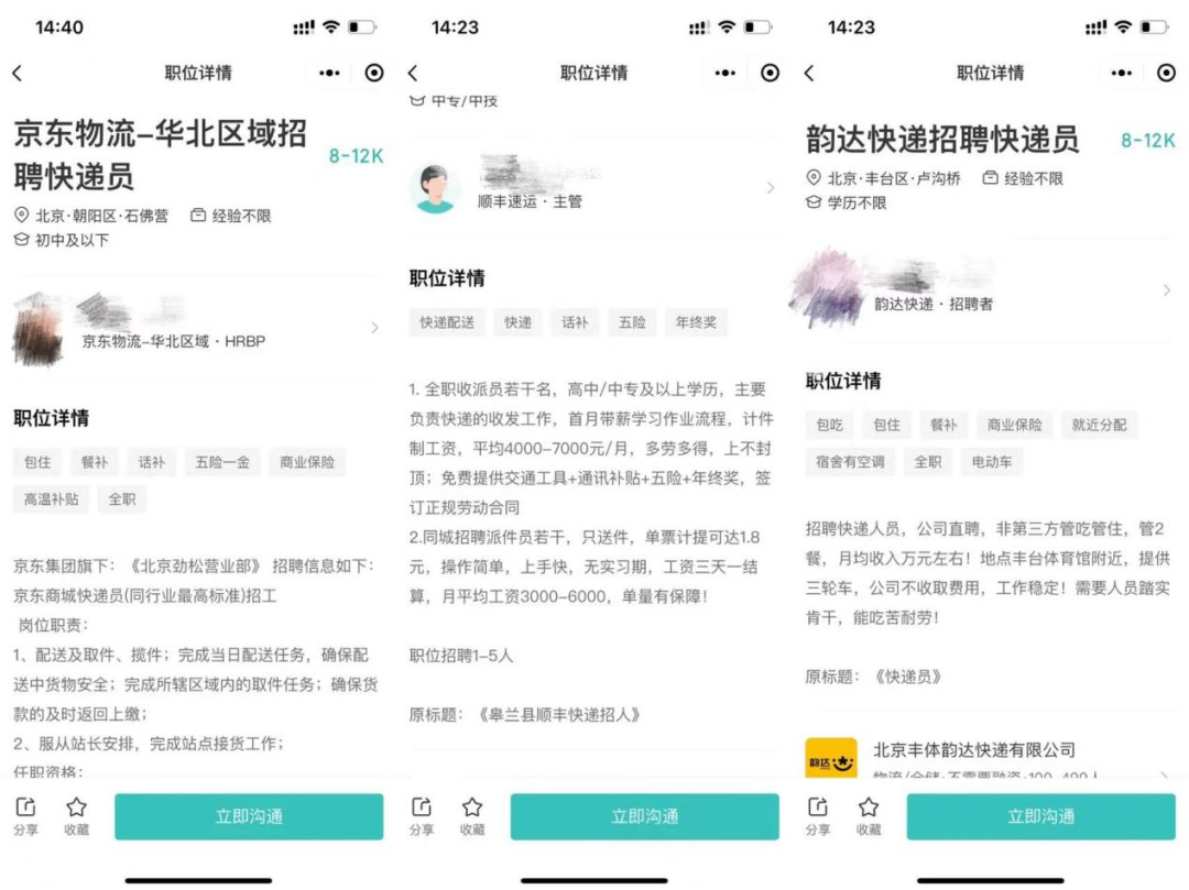 陆玖商业评论在BOSS直聘上对比了一下各个快递公司之间的福利待遇后发现,确实如李韦所言,四通一达基本没有五险一金,顺丰招聘信息里鲜少提及一金,京东快递招聘时直接点明有五险一金,这也难怪,顺丰、京东的快递小哥很少会到通达系,反而是通达系的小哥都跳槽来京东和顺丰。