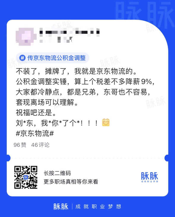 陆玖商业评论在脉脉上看到,有京东物流员工估算,这波公积金调整是实锤,算上个税差不多整体降薪9%左右。