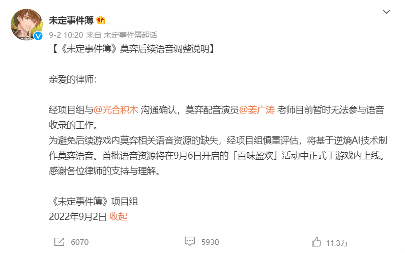 8月下旬,《未定》与《绘旅人》官微先后宣布将采用AI配音度过难关。《绘旅人》与网易互娱AI Lab合作,《未定》则使用自家开发的逆熵AI对姜广涛的声音进行提取再制作,并在未来的新卡中应用。