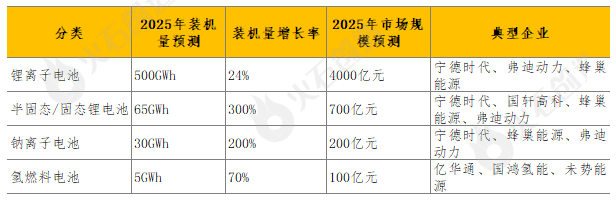 其中,锂离子电池系统将保持平稳较快增长,半固态/固态锂、钠离子、氢燃料电池系统将迎来爆发式增长。预计2025年,锂离子电池系统、半固态/固态锂电池系统、钠离子电池系统、氢燃料电池系统等市场规模将分别达到4000亿元、700亿元、200亿元、100亿元。