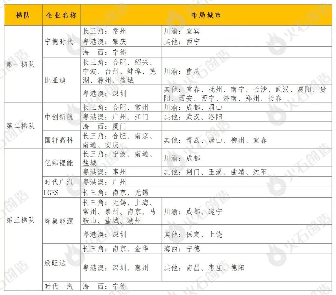 表2:动力电池企业布局城市 来源:火石创造产业数据中心