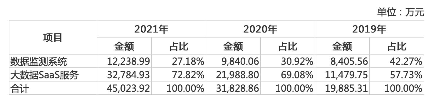 就收入结构来看,报告期内大数据SaaS服务销售收入占比逐年上升,年化复合增长率达到68.99%,明显高于公司整体收入增长率,已成为公司的核心收入来源。而这与公司的业务模式有关,由于数据监测系统为云计算及AI算法引擎提供数据基础,大数据SaaS服务基于公司自研的基础云平台和SaaS应用平台对上述数据实现智能分析,并以SaaS云服务方式向客户提供服务。因此,客户在购买公司的数据监测系统后一般会存在长期稳定的大数据SaaS服务需求。