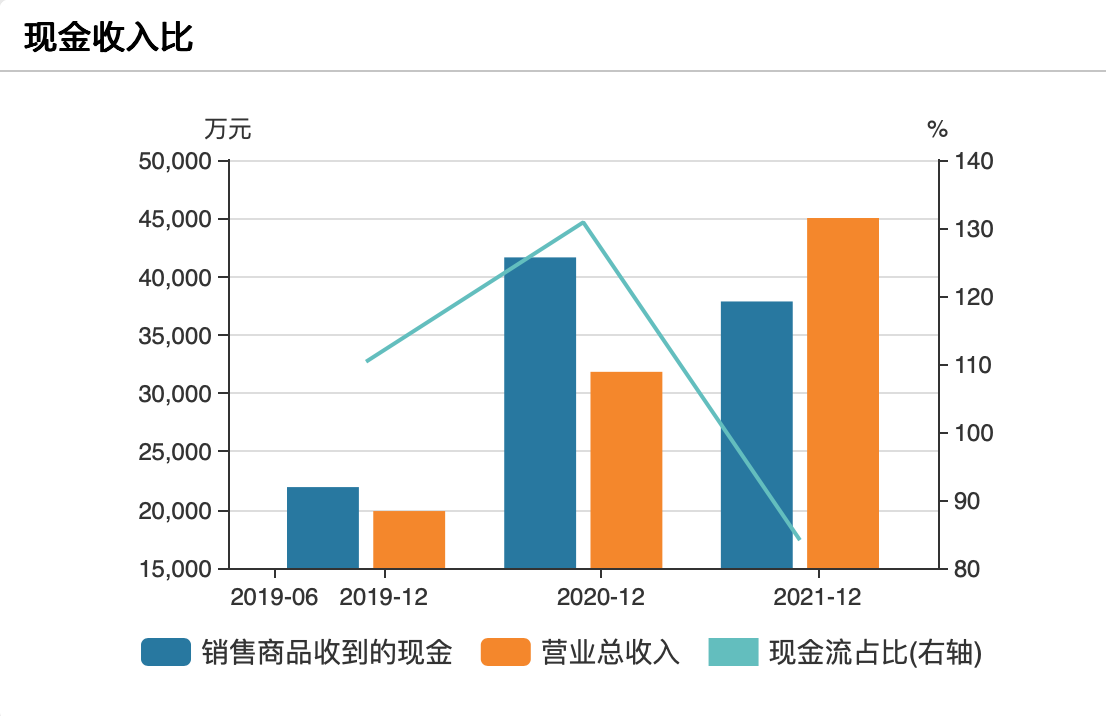 同时公司回款效率越来越低,2019年-2021年应收账款周转率分别为11.33次、7.79次和5.00次。从现金收入比可见,2021年由于应收账款占比较大,导致销售商品收到的现金仅占营收的84.22%。2020年虽然收到现金远高于营收,但若去除1.90亿元的新增合同负债,现金收入比仅为71.07%,且当年的经营性现金流将为负。