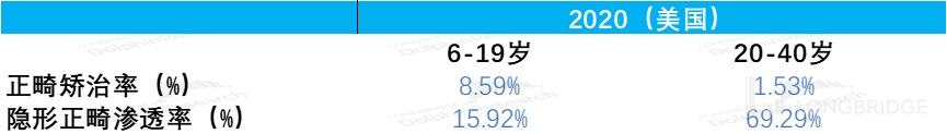 首先通过错颌病发率筛选出不同时间及年龄段的患者人数,然后在通过正畸矫治率确定总体的正畸病例数,最后通过隐形正畸渗透率计算隐形正畸病例数,其中正畸矫治率和隐形正畸渗透率的增长空间参考了美国 2020 年的数据,同时也中性的考虑了天朝的人均收入、口腔健康意识和疫情等软性因素。