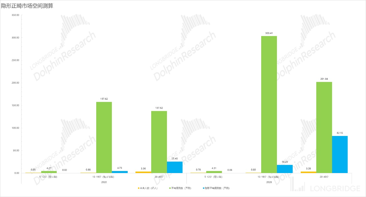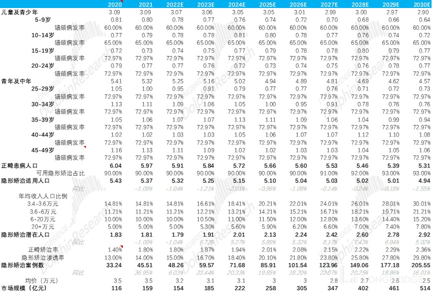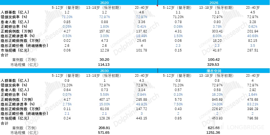 2)海豚君在做测算时将年龄段进行了更加详细拆分,并参考了不同年龄段的错颌病发率,并没有统一按照 74% 进行无脑计算;