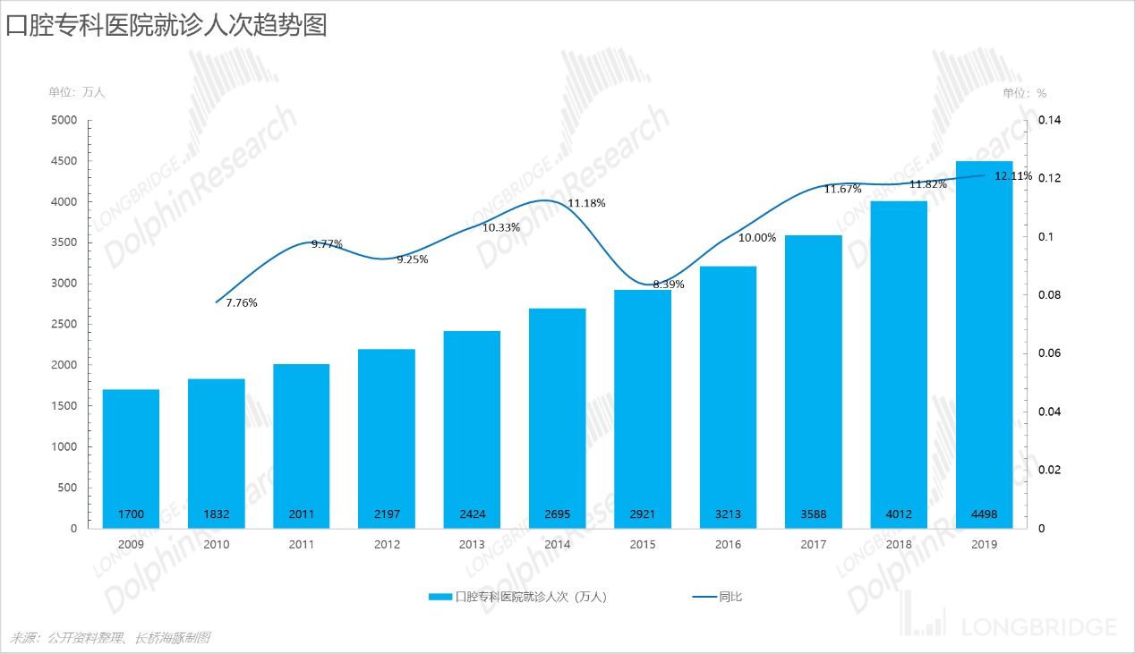 口腔方面的需求跟收入是正相关的,收入越高,对口腔的关注度也就越高,过去十几年随着大家收入提高,口腔方面的关注度也是稳步提升,并且口腔专科医院的就诊人次保持向上增长趋势。针对当下的环境,海豚君认为经济有周期,疫情有反复,但拉长时间看居民收入增长的大趋势没有变,口腔方面的支出也很会是增长趋势,钱多的基础会慢慢更加牢固,促进矫治率提升。