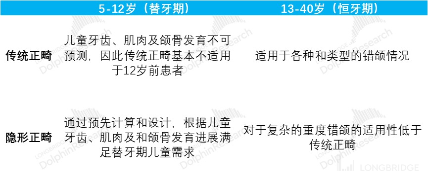 2.扩展替牙期儿童:隐形正畸相比传统正畸可以为 5-12 岁替牙期的儿童做更好的预防正畸,进一步扩大了正畸适用人群,海豚君认为传统正畸需要在牙齿基本形成后,再进行矫治的效果最好,但是隐形正畸可以通过预判设计矫治器,然后更好的引导牙齿走向,最终得到正畸的效果。
