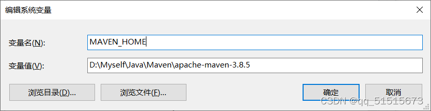 变量值(要根据自己的安装路径配置):D:\Myself\Java\Maven\apache-maven-3.8.5