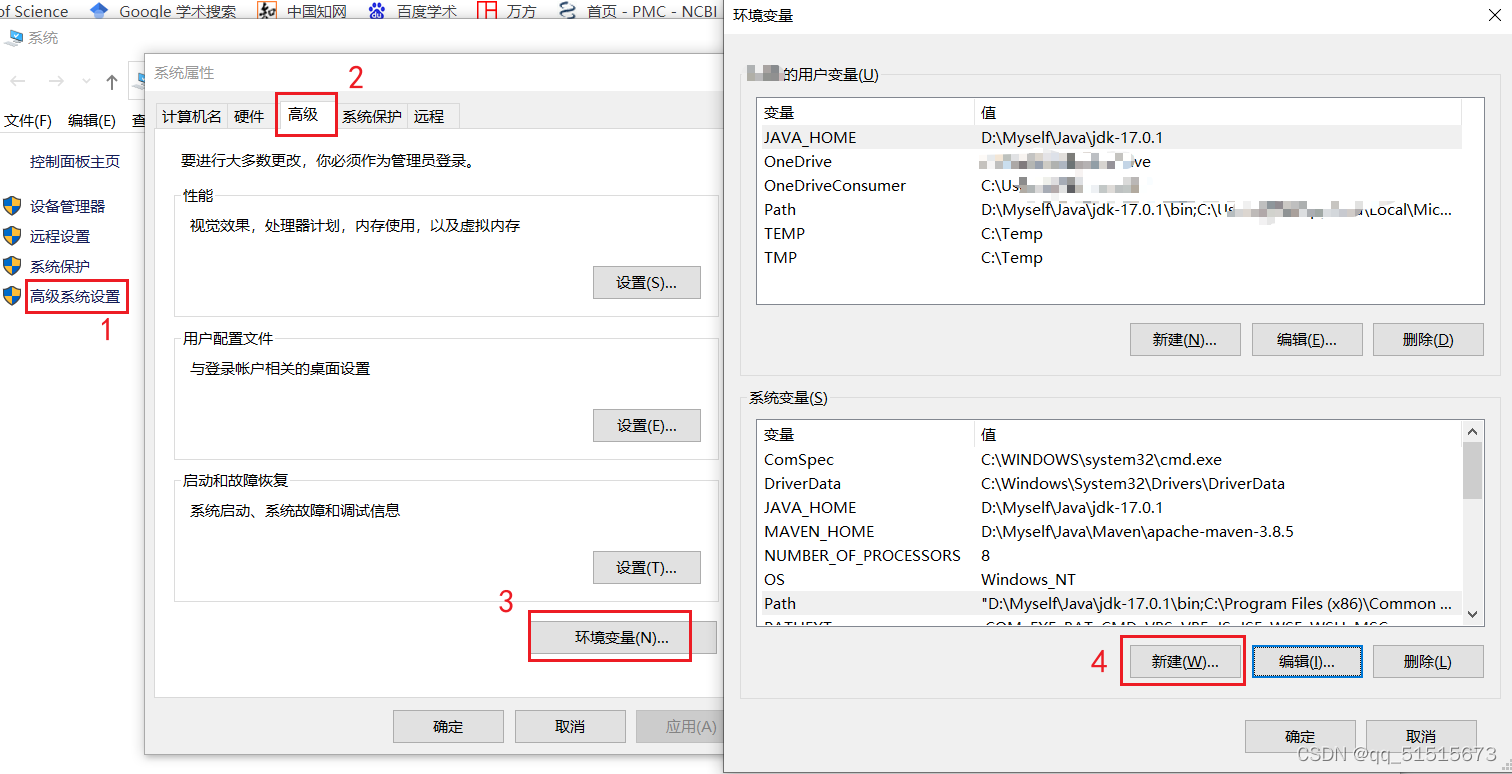 2、依次点击 系统高级设置--->高级--->环境变量--->新建(系统变量)