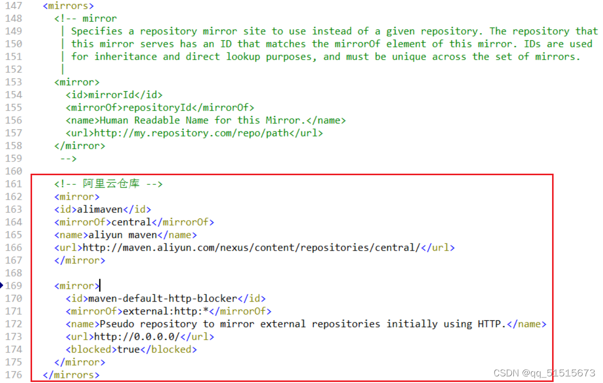同样找到settings.xml配置文件,找到<mirrors>和</mirrors>节点之间添加如下配置: