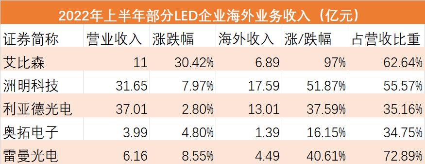 据了解,今年以来,随着海外疫情管制逐渐放开,各类商展、文旅、演出、体育等聚众型活动陆续重新开放,带动LED大屏需求回暖,市场景气度回升,不少企业海外收入都有不小的增长。此前,钛媒体APP在采访中了解到,深圳某LED显示屏出口企业今年的订单量增加了30%。A股部分企业上半年海外收入情况如下: