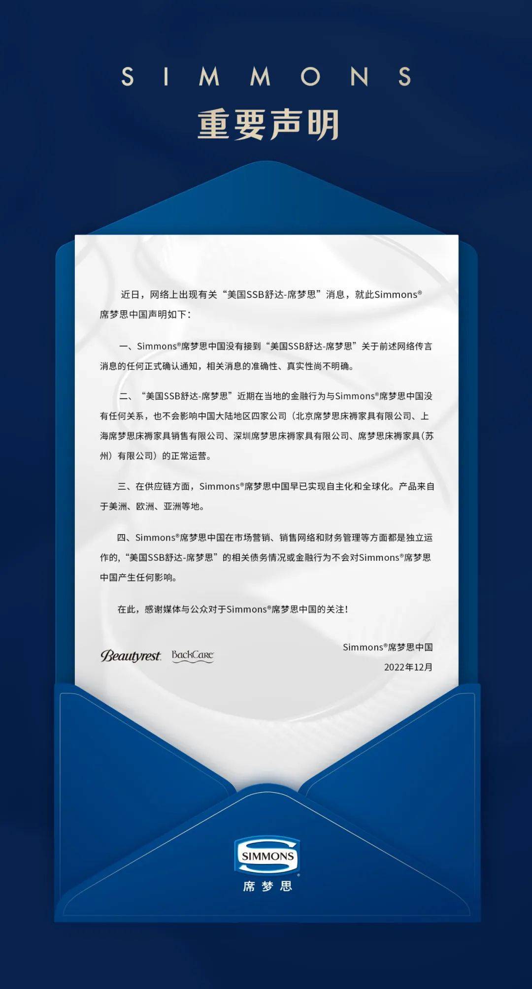 对此,舒达-席梦思官方表示不对谣言和猜测发表评论。与此同时,席梦思中国也在官网声明称,目前无从确认传言的真实性,同时席梦思中国独立运作,美国总部的行为不影响在中国的生产、营销和销售工作。