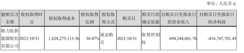2021年8月,通过参与司法拍卖公开竞拍方式竞得银隆新能源股份有限公司(以下简称“银隆新能源”)336,197,406 股股份,占银隆新能源 30.47%股权 。2021 年 11 月 09 日,银隆新能源更名为格力钛新能源股份有限公司(以下简称“格力钛新能源”) 。自收购日至年末,格力钛营收6.94亿元,亏损4.17亿元。(本文首发于钛媒体APP,作者 | 夏峰琳)