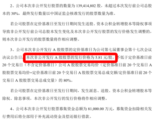 与问询函回复一同发布的还有盾安环境A股非公开发行预案(更新稿)。这意味着这桩去年11月就通过公司董事会审议的定增有了新进展。 在这个预案中,盾安环境欲向格力电器发行约1.39亿股股份,募资8.1亿元。需要提及的是,这次定增的发行价格为5.81元/股,约是盾安环境7月12日11.68元收盘价的49.74%。