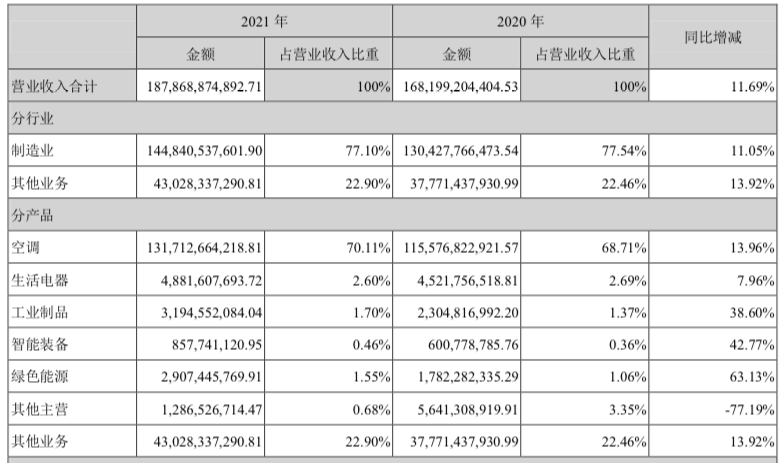 事实上,格力电器也一直在进行多元化发展,但方向不全在家电行业。早些年,格力电器就扩张家电以外的新业务,涉及智能装备、精密模具、再生资源等。近两年又先后入股闻泰科技、新疆众和、三安光电进军新能源、半导体、医疗健康等行业。截至2021年末,这些新业务对格力电器业绩影响都非常小,收入贡献最高不足2%。