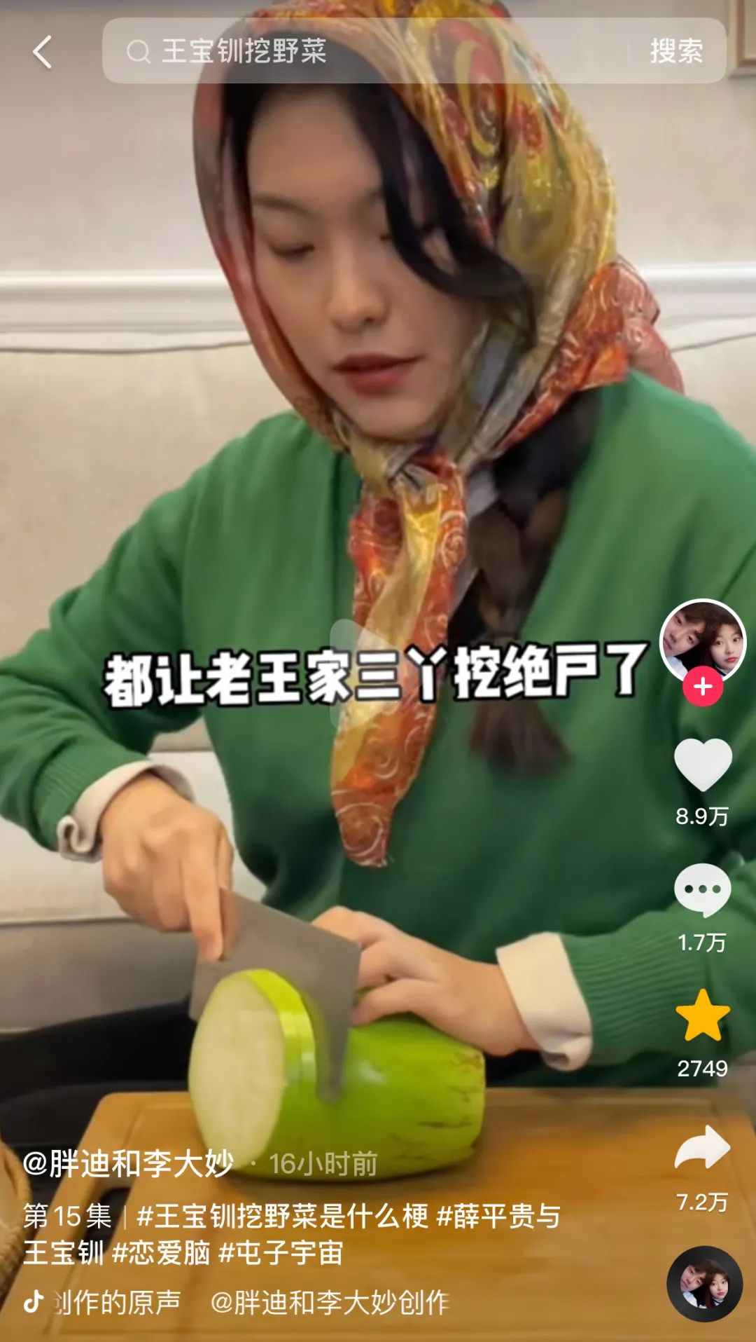 A:“他婶子,我寻思今天上山挖点野菜咱姐俩蘸酱。这可倒好,一根没挖着。”B:“咋能呢,那么大山头没有?”A:“说啥呢,这野菜都让老王家三丫头挖绝户了。”感谢王宝钏,为枯竭的短视频创意添砖加瓦。抖音博主“胖迪和李大妙”的演绎,让硬糖君拍案叫绝。