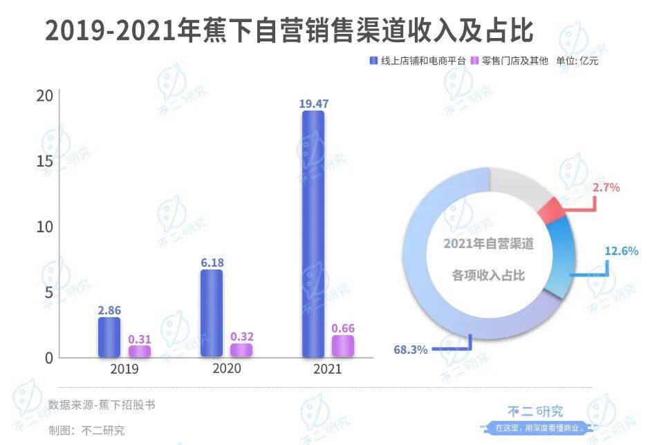 2019-2021年,蕉下线上店铺和电商平台产生的收入分别为2.86亿、6.18亿和19.47亿元;通过零售门店及其他(主要包括向拥有成熟零售网络的大客户销售)产生的收入则分别为0.31亿、0.32亿和0.66亿元。