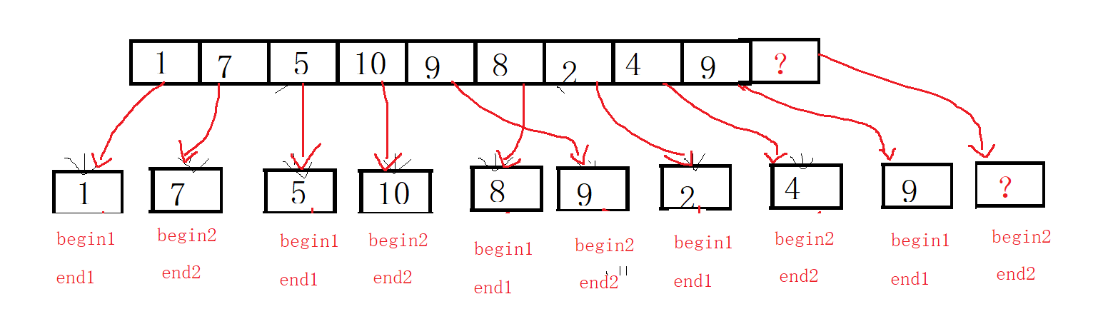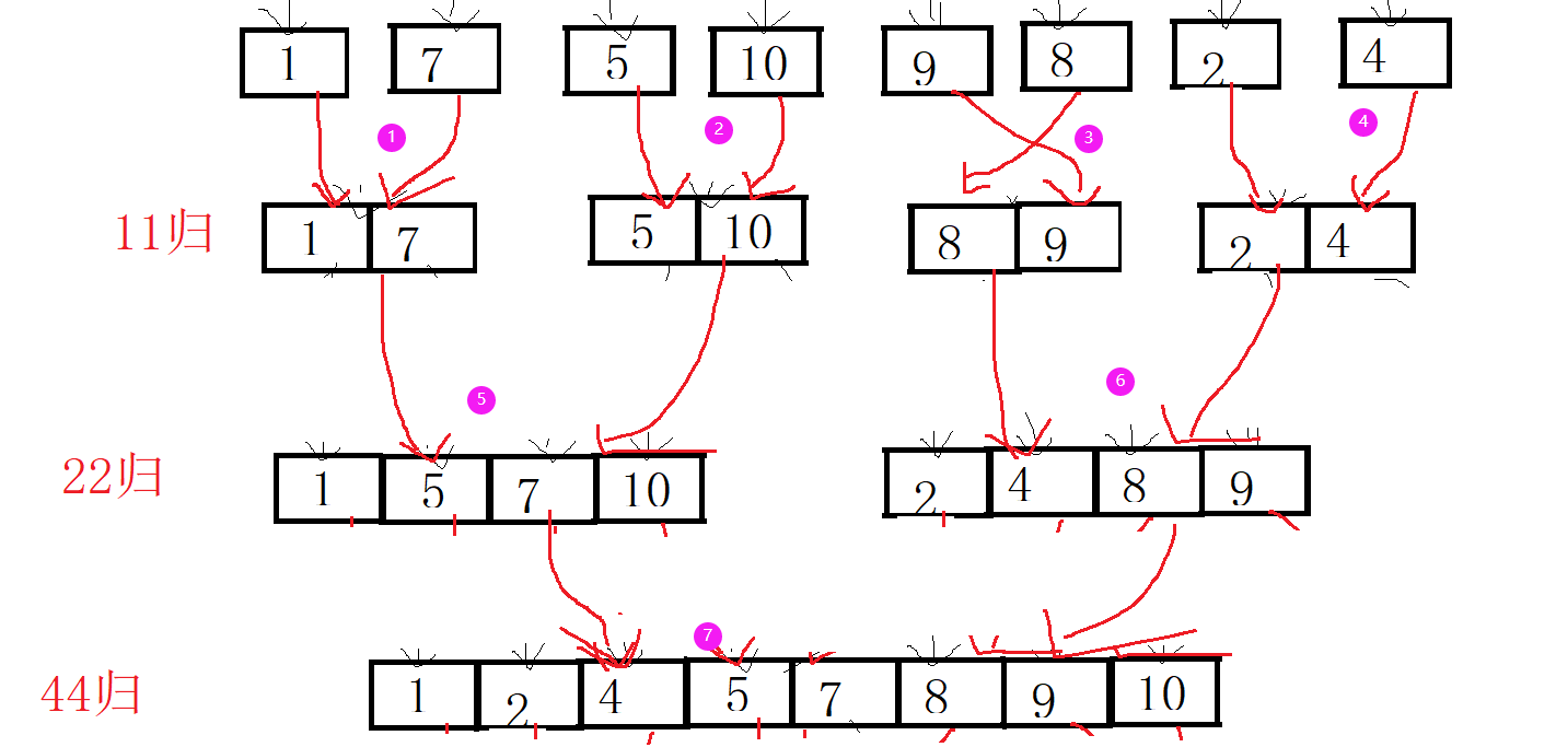 给定一个数组 1 7 5 10 9 8 2 4 6 3,怎么通过归并的思想进行排序?