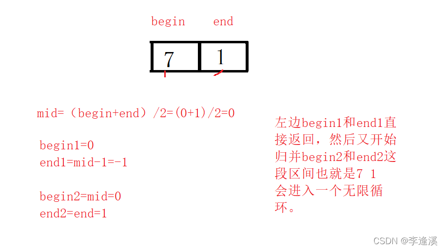 void _merge(int* a, int* temp, int n)//非递归 { int gap = 1; while (gap < n) { for (int i = 0; i < n; i += 2 * gap) { int j = i; int begin1 = i; int end1 = i + gap - 1; int begin2 = end1 + 1; int end2 = begin2 + gap - 1; //越界调整 if (end1 >= n) { end1 = n - 1; } if (begin2 >= n) { begin2 = n; end2 = n - 1; } if (begin2 < n && end2 >= n) { end2 = n - 1; } //当gap==1时就是11归、等于2就是22归 while (begin1 <= end1 && begin2 <= end2) { if (a[begin1] < a[begin2]) { temp[j++] = a[begin1++]; } else { temp[j++] = a[begin2++]; } } while (begin1 <= end1) { temp[j++] = a[begin1++]; } while (begin2 <= end2) { temp[j++] = a[begin2++]; } } //注意这里可以11归并之后再拷贝上去。 memmove(a, temp, sizeof(int) * n); gap *= 2; } free(temp); }越界调整补充说明: