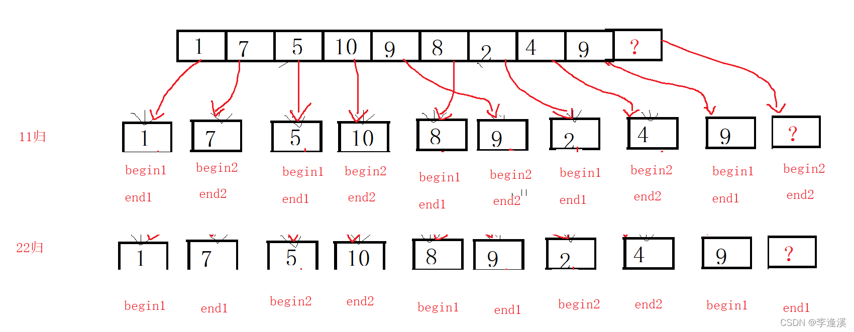 void _merge(int* a, int* temp, int begin ,int end)//递归 { if (begin >= end) { return; } int mid = begin + ((end - begin) >> 1); int begin1 = begin; int end1 = mid; int begin2 = mid + 1; int end2 = end; _merge(a, temp, begin1, end1); _merge(a, temp, begin2, end2); //合并两个有序数组 int index = begin;//记录begin while (begin1 <= end1 && begin2 <= end2) { if (a[begin1] < a[begin2]) { temp[begin++] = a[begin1++]; } else { temp[begin++] = a[begin2++]; } } while (begin1 <= end1) { temp[begin++] = a[begin1++]; } while (begin2 <= end2) { temp[begin++] = a[begin2++]; } //这里一定要拷贝回去,否则递归返回的时候左右两边不是有序的 memmove(a + index, temp + index, sizeof(int) * (end - index + 1)); }💦2.3非递归实现